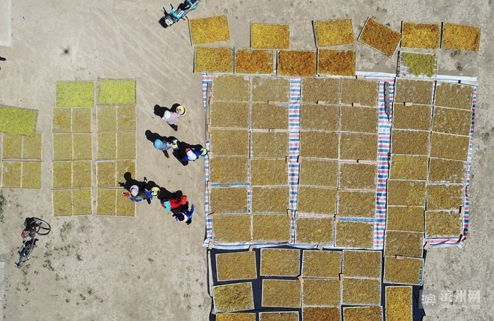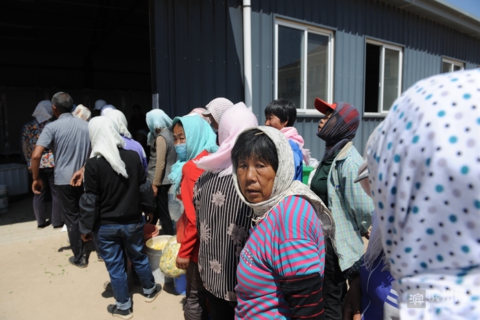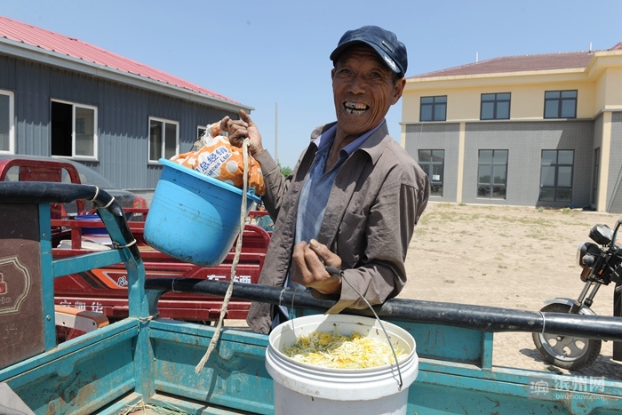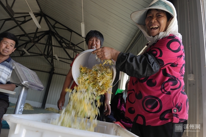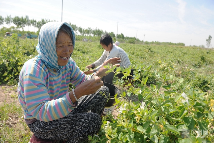 在不远处,是公司的烘干车间,金银花采摘后将在这里就地烘干,然后被下游的药厂收走。九帆科技的负责人郭崇杰正在忙着引导女工们有秩序地把采来的金银花过称,然后按照重量给大家记工,这些女工大多在四五十岁以上,是留守家中的中老年人,如今本来赋闲家中的她们也有了挣钱的路子,花期采摘季,每人每天能收入100至150元不等。