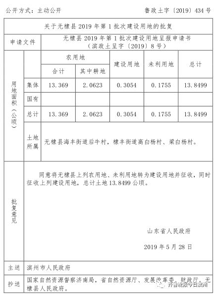 同意征收无棣县海丰街道后牛村,棣丰街道高白杨村、梁白杨村总计13.8499公顷建设用地。