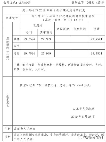 同意征收邹平市黄山街道杨寨村、见埠村,西董街道崔家营村、夫村、台头村、太平村总计29.7524公顷建设用地。