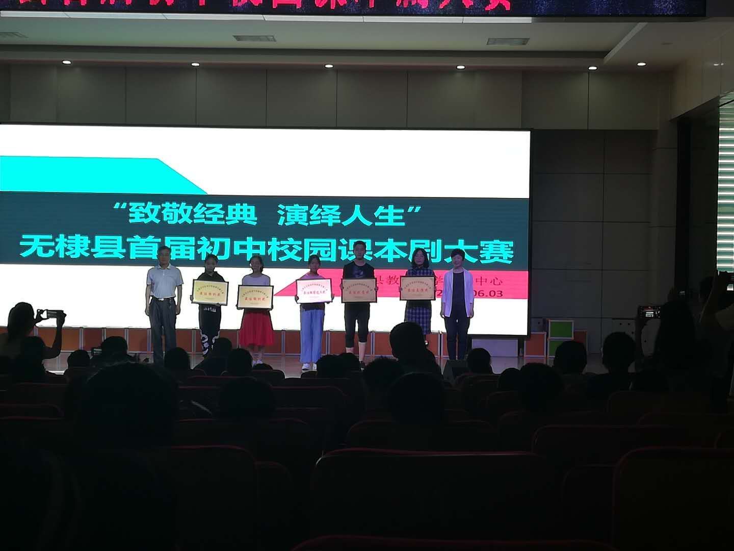 为进一步丰富校园文化生活,培养学生的创新精神和实践能力以及“静中悟、动中思、主动学”的良好习惯,提高学生艺术的表现力和语言表达能力,让学生有一个展现自我的舞台,无棣县召开首届初中校园课本剧大赛。在本次大赛中,水湾镇中学代表队八位同学在老师们的指导下团结协作、倾情演出,最终获得了全县团体总分二等奖以及最佳道具服装奖的好成绩。