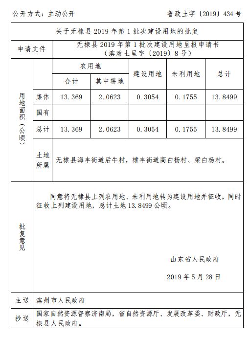 同意将无棣县海丰街道后牛村,棣丰街道高白杨村、梁白杨村总计13.8499公顷农用地、未利用地转为建设用地并征收。