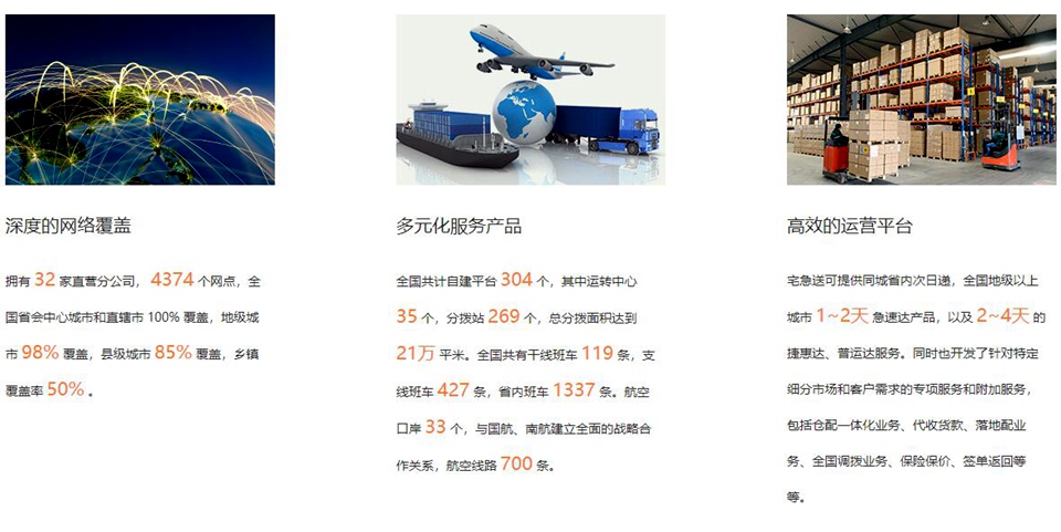 宅急送自营资源:信息化、核心仓资源、转运分拨体系、门店配送、最后一公里个性化和高品质化服务。