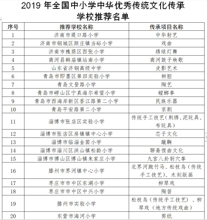 7月5日,山东省教育厅发布《2019年全国中小学中华优秀传统文化传承学校推荐名单公示》。