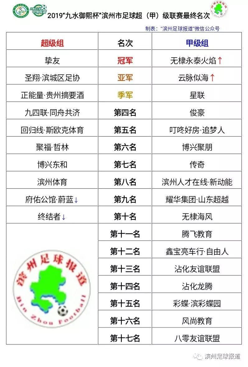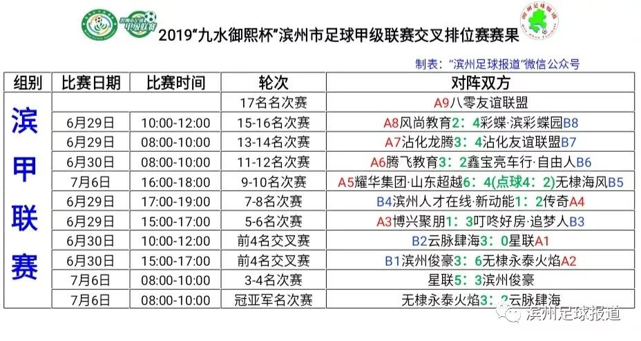 6月29日、30日、7月6日2019“九水御熙杯”滨州足球甲级联赛(下称:滨甲联赛)经历了交叉排位赛及冠亚季军争夺战,结束了整个赛季全部比赛的争夺。以下为交叉排位赛及冠亚季军争夺战各场次赛果、最终排名榜、射手榜: