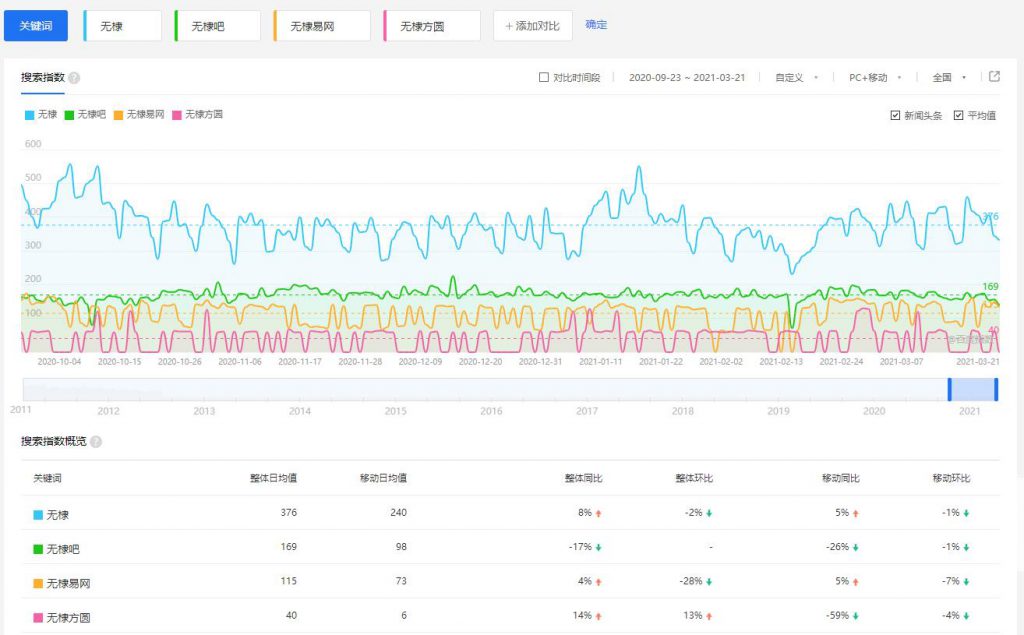 2011-2021年与无棣相关的几个关键词,百度搜索指数数据对比